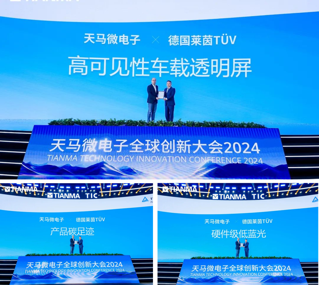 本次大会上,天马还正式发布了《天马碳中和白皮书》,开启绿色新篇章。对此成为表示,在白皮书的指导下,天马未来将继续秉持人类命运共同体理念,坚定不移推进绿色低碳可持续发展,并将持续优化策略,精准实施碳中和规划,加速绿色转型,向着全球显示领域可持续发展领先企业目标坚定迈进。随后,国际独立第三方检测、检验和认证机构德国莱茵TüV,为天马颁发了《高可见性车载透明屏》《产品碳足迹》《硬件级低蓝光》三大证书,为产品、质量的发展设立更高标准。