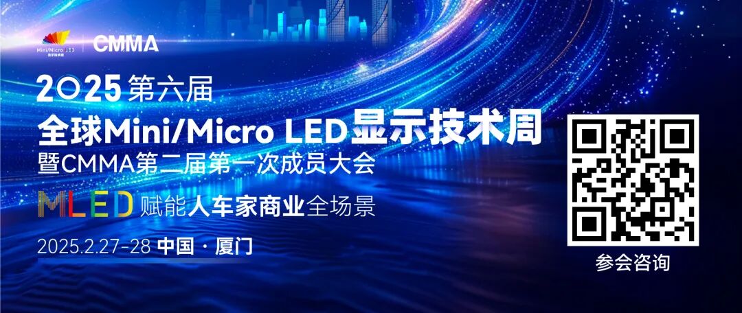 2025年第六届全球Mini/Micro LED显示技术周暨CMMA第二届第一次成员大会将在2025年2月27日-28日在厦门召开,以“MLED赋能人车家商业全场景”为主题,Mini/Micro LED全产业链企业及行业精英人士共同聚焦MLED产业链迭代发展与应用场景扩大趋势,围绕Micro LED直显电视发展态势、Mini/Micro LED车载显示及照明加速渗透以及Micro LED微显示与AR等方向,探索MLED在消费电子、智能出行、家居生活与商用展示等多维度的最新成果与未来潜力,推动MLED商业化进程,加速MLED产业链迭代,助力中国Mini/Micro LED产业突破发展。
