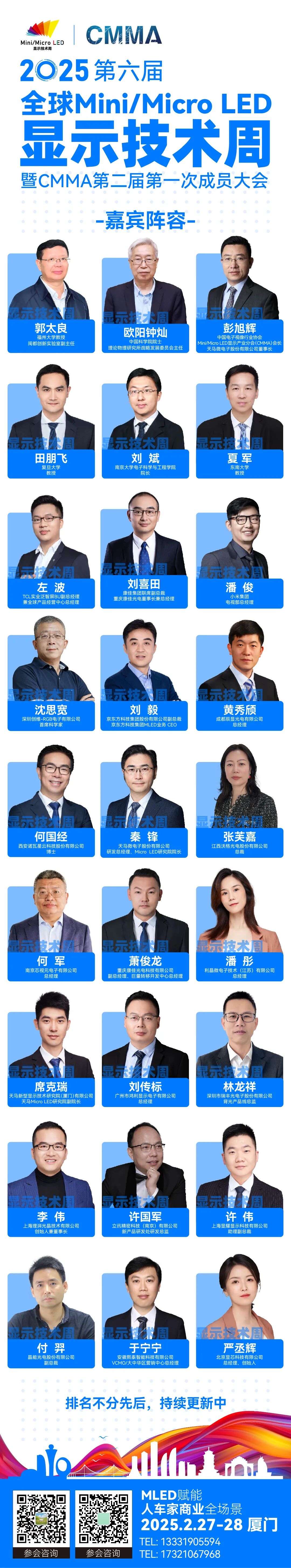 由中国电子视像行业协会指导,中国电子视像行业协会Mini/Micro LED显示产业分会(CMMA)主办,天马微电子股份有限公司联合主办,中国电子视像行业协会智能显示车联网分会、Micro LED生态联盟、厦门大学、厦门市未来显示技术研究院协办的2025年第六届全球Mini/Micro LED显示技术周暨CMMA第二届第一次成员大会将在2025年2月27-28日在厦门召开,以“MLED赋能人车家商业全场景”为主题,携全产业链企业及行业精英人士共同聚焦MLED产业链迭代发展与应用场景扩大趋势。